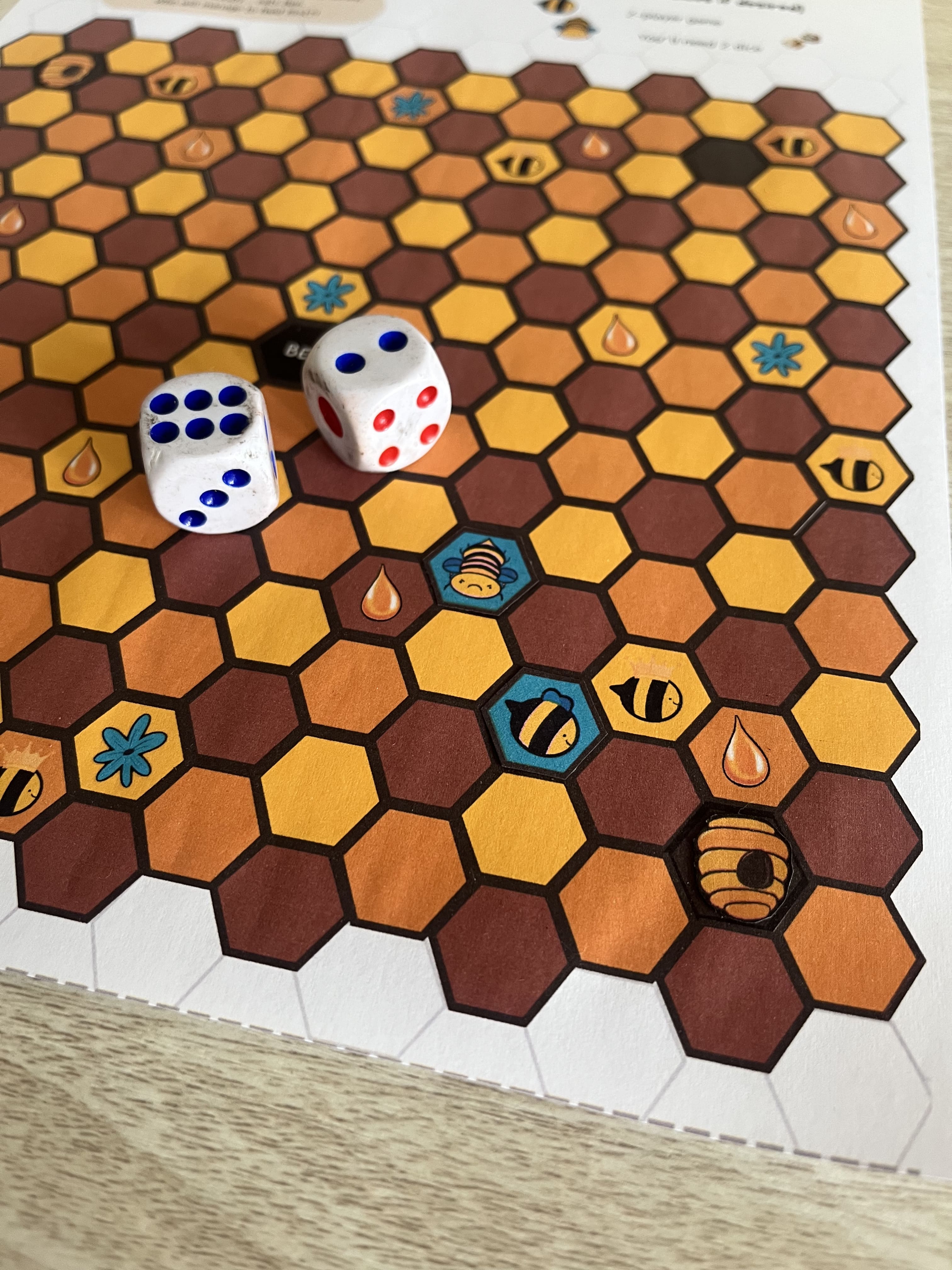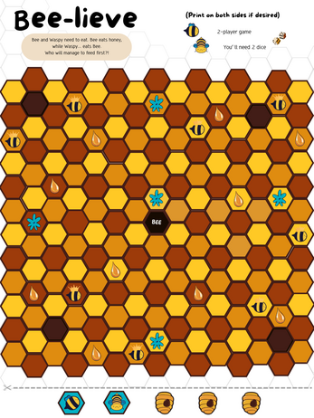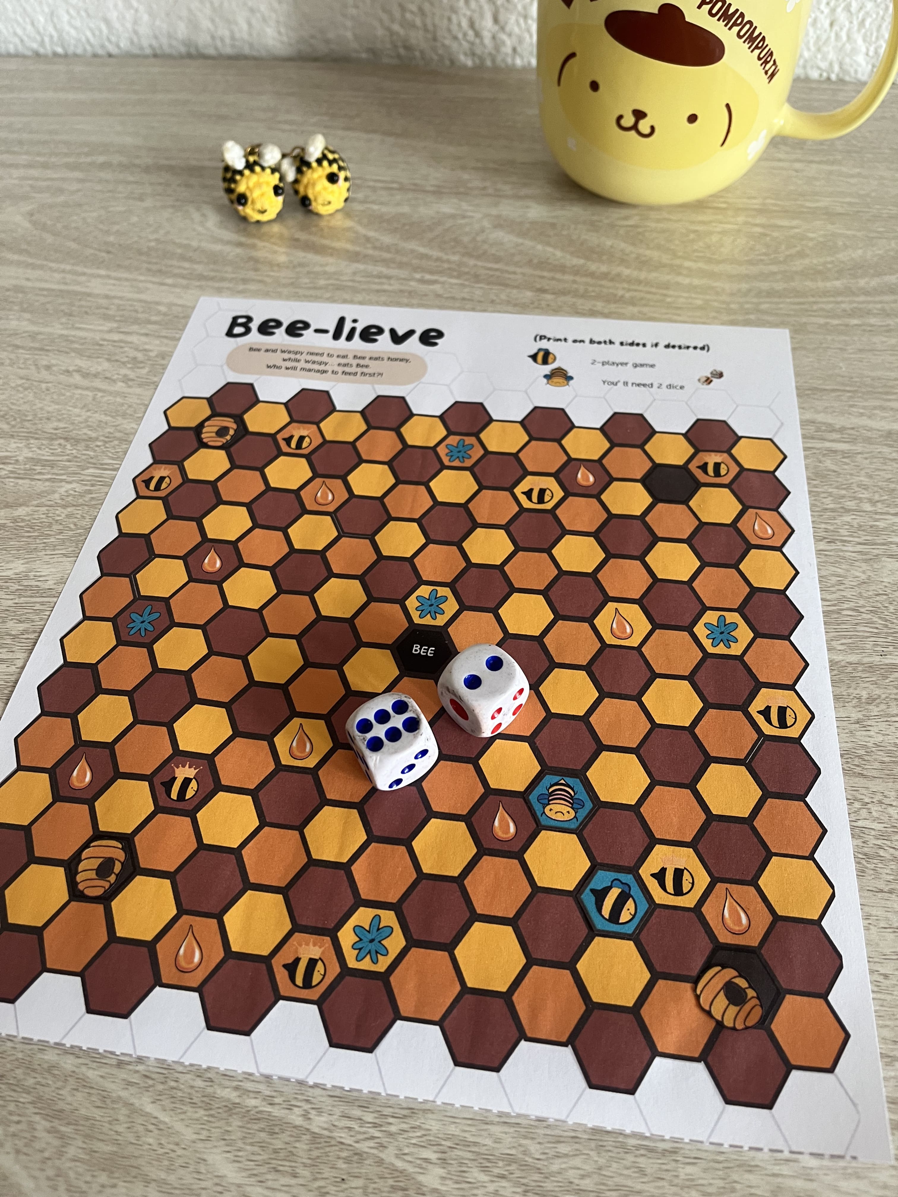 Bee-lieve is a two-player dice-throwing game where you try to get fed, either with honey or the other player. With some strategy and a little bit of luck, you can have a nice meal and beat the other player.