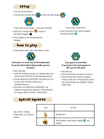 - One die determines ROTATION: how Bee turns on its axis (YOU CHOOSE clockwise or counterclockwise).